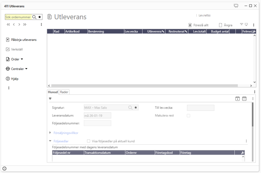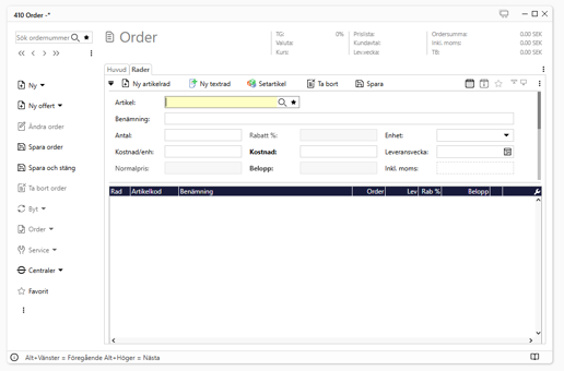 Du kan skapa olika vyer med information och du har snabb åtkomst till order- och utleveransrutinerna. Även utskrifter av orderblanketter och fakturering kan ske från denna central.