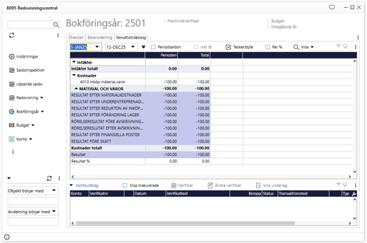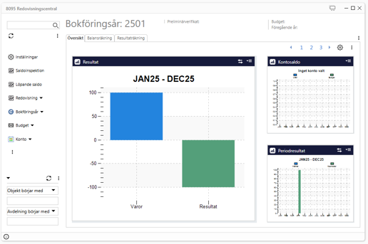 Centralen ger dig information om balans- och resultaträkningen direkt. Här har du också möjlighet att titta på resultatet i olika nivåer som t.ex mer detaljerat på kontonivå eller mer övergripande på kontogruppsnivå eller ännu mer övergripande på kontoklassnivå. Drilldown funktion för att se saldoförändring för specifikt konto och vidare för att titta på bakomliggande verifikat. Om du önskar se resultatet för vissa avdelningar så är det självklart också möjligt. Från
