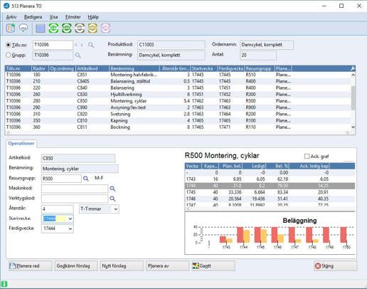 MPS används för att hantera planering och beläggning av resurser. Operationer och resursgrupper har parametrar för planering och du kan grafiskt se hur kapacitet och beläggning varierar vecka för vecka. Rapportering kan ske direkt i verkstaden via körplanen.