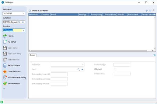 I rutin 755 Kundbonus, beräknas och utbetalas bonus. Rekommenderas att bonusutbetalningen görs vid periodens slut.