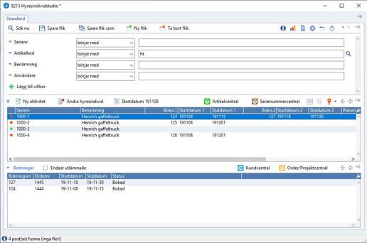 Alla hyresartiklar som är individhanterade kan bokas via en översiktsgraf. Här får man en tydlig bild över alla individer och när man valt hyresobjekt kan man direkt se vad som finns ledigt.